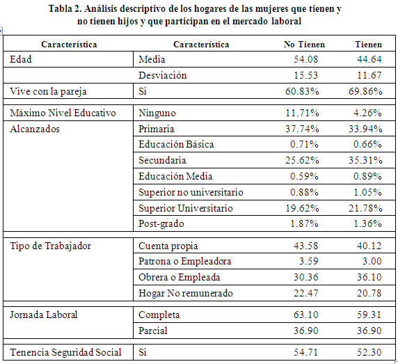 En la tabla 2 se muestran las estadísticas descriptivas de la base de datos de los hogares ecuatorianos con mujeres ocupadas que tienen hijos contra los que no tienen hijos. Las no madres tienen una media de edad 10 años más alta aunque tienen una desviación estándar cercana a los 15 años. Mientras que la media de la edad para las madres es de 44 años con una desviación de 10 años. Asimismo se observa un alto grado de madres solteras trabajadoras, ya que cerca del 69% de las madres encuestadas no viven con su pareja.