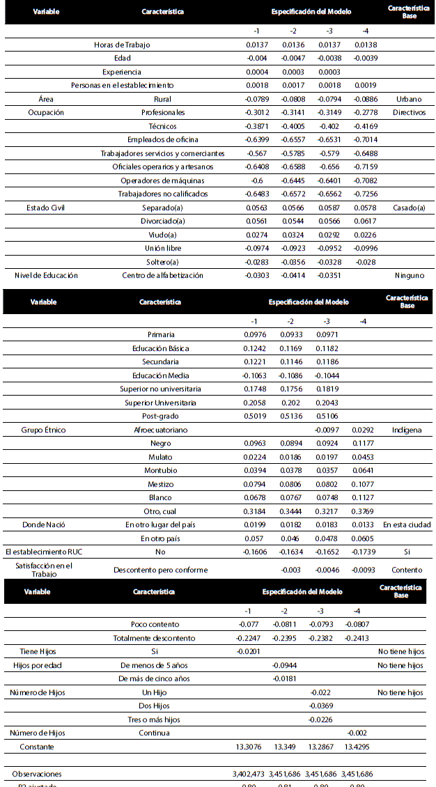 En la Tabla 3 se muestran los resultados de las estimaciones sobre la ecuación 1 con cada una de las especificaciones enunciadas en la sección anterior, usando las variables seleccionadas mediante los datos disponibles para las mujeres ocupadas dentro de la encuesta de trabajo del INEC (Ecuador) para el año 2012. Se exponen las observaciones totales, el R2 ajustado y las variables tanto continúas como categóricas, sus características y el efecto porcentual que tienen sobre el ingreso laboral promedio.