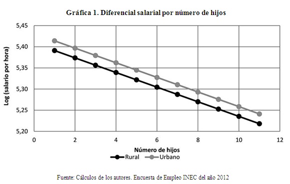Por último, la especificación 4 permite calcular que por cada niño adicional, el salario de la mujer se reduce en un 0.002% en promedio. En la gráfica 1 se muestra el resultado de un ejercicio que consistió en interactuar el promedio del salario con la tenencia de hijos por el área donde vivía la mujer. En este sentido, se muestra que la caída del salario a medida que se tienen más hijos es constante, tanto a nivel urbano como rural. La brecha observada entre los salarios en el mercado rural y urbano es característico de los sistemas de producción duopolios en los diferentespaíses de Latinoamérica (Reyes, 2011). En Ecuador para 2012, el diferencial era cercano al 8% según la encuesta empleada en este estudio.