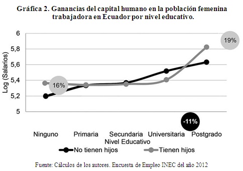 This paper analyses the effect of motherhood on women’s wages in 2012 in Ecuador studying tenure, the number and age structure of the children is analyzed. The methodology implemented Mincerian equations on labor income data from household surveys; to further decompose the differential method Oaxaca Blinder corrected for selection bias. The results show that mothers earn on average 7.56% less than non-mothers, presenting a high heterogeneity among provinces analyzed and educational levels. After controlling for age of the children shown that mothers of children under five years earn 10% less, while mothers with children over five years, the decrease is only 2%. By number if the woman has two children in their care gap for maternity average is 3.7% and if you have more than two children rebate is 2.26%. However, most of the gap maternity in Ecuador is not caused by the fact that mothers but for its intrinsic socioeconomic characteristics.