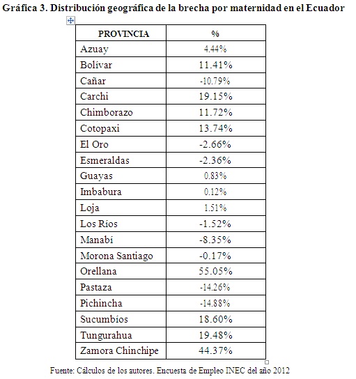 Los resultados muestran que la brecha salarial no se distribuye equitativamente para todas las provincias del Ecuador siendo las más afectadas por este fenómeno las localizadas en el Pichincha, Esmeraldas, Oro, Guayas con una baja del 14% en el salario de las mujeres que tienen hijos frente a las que no tienen. Este diferencial está causado en su totalidad por las diferencias en las características de las mujeres ocupadas.