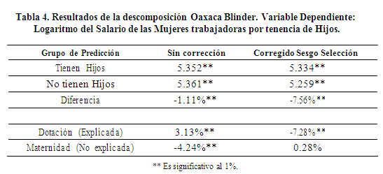 Las estimaciones con la metodología Oaxaca Blinder con corrección del sesgo de selección de Heckman sugieren que las mujeres que tienen hijos ganan en promedio 7,56% menos que las no madres. Luego de realizar otras especificaciones y controlar la edad de los hijos, se aprecia que las madres de niños de menos de 5 años ganan un 10% menos que las mujeres que no tienen hijos, mientras que las madres que tienen niños de más de 5 años, su salario disminuye en solo el 2%. Por número, si la mujer tiene a su cuidado dos hijos la brecha salarial por maternidad promedio es del 3,7% y si tiene más de dos hijos la rebaja salarial es del 2,26%.