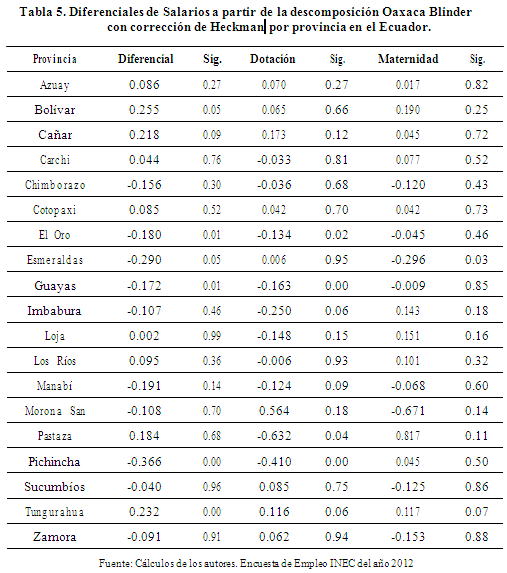 Por regiones (tabla 5), los análisis indican que 4 regiones tuvieron diferenciales salariales significativos entre madres y no madres: Pichincha (-36.58%), Esmeraldas (-28.98%), El Oro (-17.99%), Guayas (-17.24%). En todos los casos, a excepción de Esmeraldas, la brecha es explicada en su totalidad de manera significativa por la dotación de las mujeres que no tienen hijos, tales como la educación, la experiencia o las características de las empresas donde laboran. En el caso de la Provincia de Esmeraldas el diferencial es del 29% en contra de las mujeres y está causada por su condición de ser madres u otras variables observables.