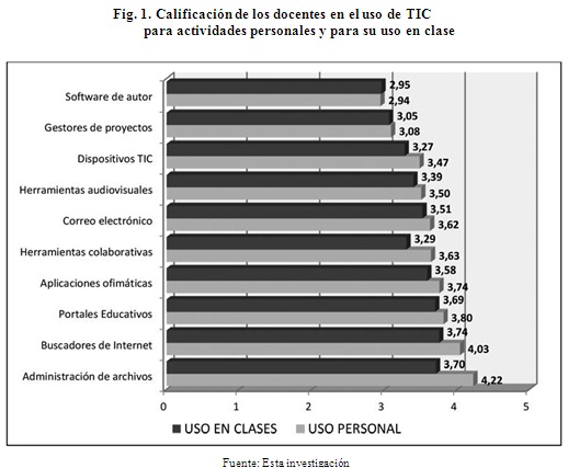 Respecto al uso personal el promedio de la calificación de los docentes es de 3,6 en una escala de 1 a 5. Todas las valoraciones en el uso de herramientas como programas ofimáticos y servicios de internet están por encima de 3,0 excepto el uso de software de autor con una evaluación de 2,9. Respecto al uso educativo, las evaluaciones son levemente menores en todos los aspectos (promedio de 3,5), situación que claramente indica que, si bien los docentes tienen buenos conocimientos en el uso de estas herramientas, no se sienten plenamente preparados para su incorporación como herramientas de apoyo en el desarrollo de sus clases.