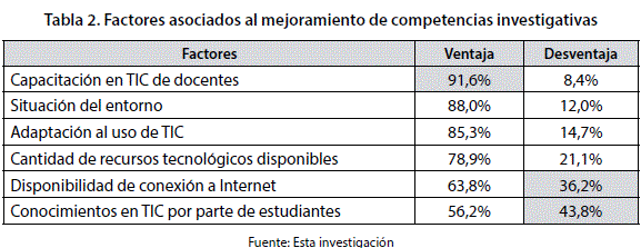 5.3. Factores asociados al mejoramiento de competencias investigativas. Para estudiar este punto, se analizó cuáles de los aspectos relacionados con el uso de las TIC se constituyen en ventajas o desventajas para el desarrollo de competencias investigativas en el entorno escolar. Los resultados pueden ser observados en la siguiente tabla: