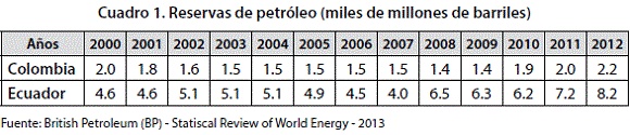 El Cuadro 1 muestra que hay una diferencia significativa en cuanto al volumen de reservas de los dos países, la cual ha tendido a crecer en los últimos años. Esta dinámica obedece, inicialmente, a que en el caso ecuatoriano la reposición de reservas es muy superior a su explotación, entre tanto, en Colombia, lo que se viene haciendo es reemplazarlas a un ritmo similar al de la producción. Para explicar esta situación se debe tener en cuenta que el stock de reservas depende de factores tales como: expectativas sobre los precios del petróleo, inversiones en exploración, intensidad de la explotación, condiciones técnicas que hagan posible dicha producción, potencial geológico del país etc.