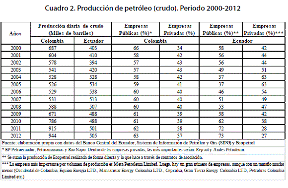 Por otra parte, mientras en Colombia la participación de empresas públicas no se ha modificado sustancialmente, aunque permanece alta, en Ecuador, sucede lo contrario. En el año 2006 las empresas estatales producían el 46% del petróleo, en 2012, dicha participación pasó a ser del 73%. La modificación de los contratos petroleros, aunado a la declaración de caducidad de los contratos de Occidental