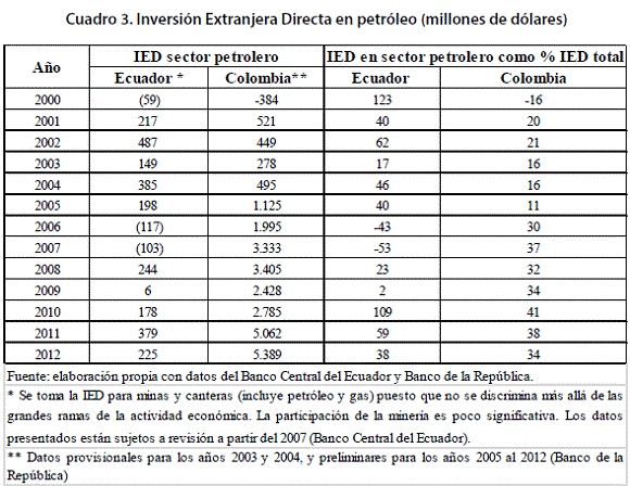 Los cambios introducidos en el marco regulatorio tienen repercusiones en el rol que entra a asumir la Inversión Extranjera Directa (IED) en el sector petrolero. Uno de los hechos más representativos es la dinámica que toma la producción de petróleo (crudo) en los dos países. En el periodo 2004–2006, Ecuador y Colombia tenían niveles de producción similares, sin embargo, a partir de 2007, mientras en el primer caso se presenta un estancamiento, en el segundo, hay un crecimiento notable. De forma paralela, la IED sufre un cambio muy marcado. Entretanto en Ecuador, hay una reducción y luego niveles de inversión relativamente bajos, en Colombia, pasa todo lo contrario, hay un crecimiento significativo. En el periodo 2007 – 2012 la IED en el sector petrolero realizada en Ecuador fue de US$ 929 millones, mientras en Colombia el monto ascendió a US$ 22.402 millones. De ahí que el rol que asume la IED en los dos países genera una diferencia importante en la trayectoria productiva durante los últimos años (ver Cuadro 3).