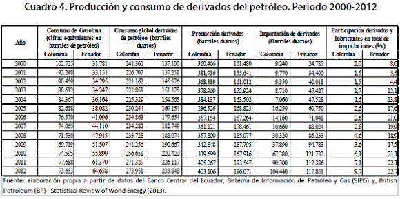 En Ecuador, un hecho que no permite que se incremente la oferta de exportación, se encuentra en que, a la vez que no creció la producción, el consumo lo hizo a una tasa muy acelerada. En el periodo 2000 – 2012, el consumo (petróleo en todos los usos) creció a una tasa media anual del 4.6%, entre tanto, la producción solamente lo hizo al 1.8%. Si se toma como referencia el periodo 2007 – 2012 las tasas serían del 5.1% y 4.6%. En Colombia, la producción de petróleo creció a una tasa media anual del 2.5% (entre 2000 y 2012) y el consumo lo hizo al 1.1%. Partiendo del año 2007 los porcentajes serían del 12.2% y 3.2% respectivamente.