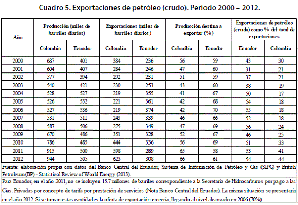 Las cifras encontradas también muestran dinámicas divergentes en los dos países, las cuales se explican, en buena medida, por las características de sus modelos de explotación petrolera. En cuanto a la producción de crudo, en el caso de Colombia, creció a una tasa media anual del 12. Por el contrario, en Ecuador, mientras en el periodo 2000 – 2006 la producción venía creciendo, a partir de 2007, empieza a descender, y permanece estancada hasta el 2012. A pesar de este fenómeno, en los dos países, las exportaciones petroleras resultan significativas; en el caso ecuatoriano, representan más del 50% del total, y en Colombia, a 2012, este porcentaje llega a ser del 44%, cuando en el año 2004, representaban el 17%.