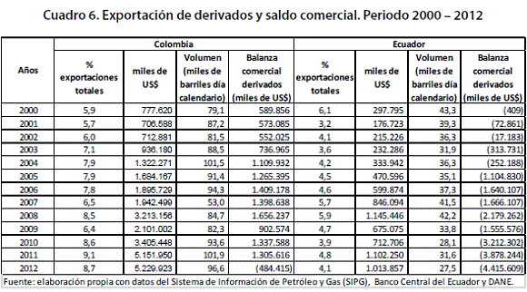 Lo más preocupante para Ecuador es el deterioro del saldo en la balanza comercial de derivados, fenómeno que se profundiza a partir de 2005, pero continúa con un ritmo acelerado bajo el gobierno de Rafael Correa. En el año 2012, el déficit llega a representar el 5.2% del PIB, algo que va a tener repercusiones directas en el presupuesto del gobierno. En el caso de Colombia, a pesar que en casi todos los años tiene un superávit, en 2012, el saldo pasa a ser deficitario.