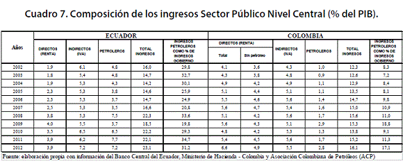 Como ya se advertía en la revisión de literatura, la bonanza en los precios del petróleo da lugar a que los ingresos fiscales tiendan a concentrarse en las rentas derivadas de esta actividad (Portillo, 2014). La información aportada da luces que ratifican la presencia de este fenómeno. Así por ejemplo, mientras en 2003, los ingresos petroleros aportaban el 7.1% de los ingresos del SPNC de Colombia, en 2012, dicho aporte había subido al 17% (ver Cuadro 7). En el caso de Ecuador la participación sería del 32.7% y 31.2% respectivamente. Por otra parte, mientras en Colombia el crecimiento es mucho más acelerado a pesar de que la base de partida es inferior, en Ecuador, dicho fenómeno es más visible desde el año 2007.