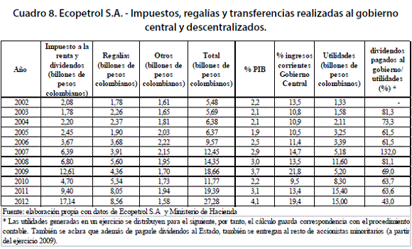 Durante el periodo 2008 - 2012, Ecopetrol S.A., aportó, en promedio, el 15% de los ingresos de la nación, lo que representa algo más del 3% del PIB (ver Cuadro 8). En el caso del impuesto a la renta, la contribución fue del 13%. Si se toma como referencia el año 2012 la participación fue del 23%. Esta información ratifica la importancia que tiene esta empresa para el Estado, particularmente desde el punto de vista fiscal.