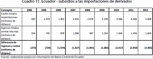 El cuadro 11 muestra el desequilibrio que genera para Ecuador la importación de derivados. Lo que se observa es que hay un creciente desajuste, lo cual confirma el impacto que dicha situación ocasiona en las finanzas del Estado. Este monto al final se computa como una reducción de las transferencias que le hace EP Petroecuador al Gobierno Central. Así las cosas, uno de los usos de la renta petrolera es precisamente la financiación de este tipo de gastos, que de ninguna manera contribuyen a su estrategia de desarrollo. Dicha situación también sería contradictoria con la idea de buscar mayor eficiencia del Estado, tal y como se insiste bajo el neoextractivismo