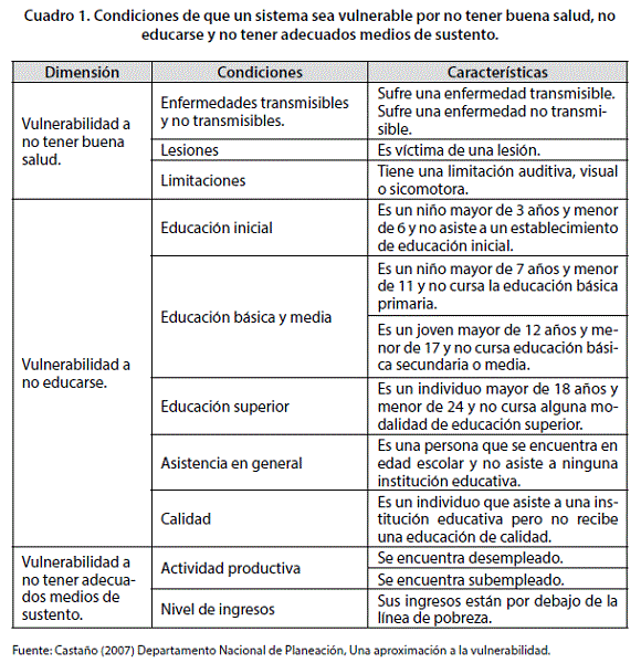 En este análisis se circunscribe la dimensión de educación, aspecto principal en el mejoramiento de las condiciones de vida, y aunque la dimensión salud y las condiciones adecuadas de sustento son consustanciales a la vulnerabilidad, su análisis se excluye dado el propósito del trabajo, a más de que los indicadores propuestos, en el caso de la dimensión salud, distan de los alcances de la Gran Encuesta Integrada de Hogares (GEIH) y de la Encuesta Nacional de Calidad de Vida (ENCV). No obstante, en vista de que no existe un marco teórico comúnmente aceptado, en este aspecto, como ocurre con muchos otros conceptos, es viable dejarlo a criterio del investigador, la definición de los indicadores pertinentes.