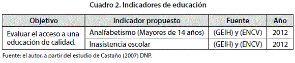 De acuerdo al criterio del autor del estudio, el análisis se refiere a la dimensión de vulnerabilidad a no educarse, los indicadores propuestos se pueden observar en el cuadro 2. Siguiendo a Castaño (2007), el objetivo de política en este punto es que las personas reciban una educación de calidad de acuerdo con sus condiciones y su edad; el análisis de los determinantes de los fenómenos planteados resulta de gran importancia en la medida en que contribuyen al diseño de política pública.