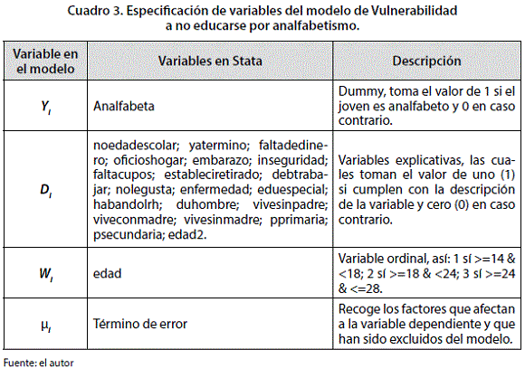This paper presents an analysis of the determinants of vulnerability among young people between 14 and 28 years. Based on the human development approach, vulnerability is explained from the perspective of education, suggesting that a young person can be vulnerable to not educated either illiteracy or truancy, selecting the dimension is in the importance It has the same engine in a society like development.