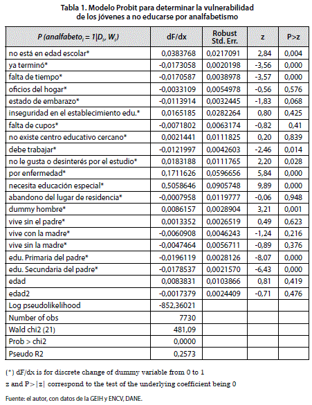 La estimación en primera instancia procura explicar los determinantes de la vulnerabilidad a no educarse, para ello se ha tenido en cuenta los indicadores propuestos en la dimensión y en este sentido se ha corrido el primer modelo para definir las causas que determinan el hecho de que un joven sea analfabeta/o. El porcentaje de jóvenes que no saben leer y escribir es de 2,16%, si bien resulta relativamente bajo, es preocupante en la medida en que aún existe un frente que se debe tratar.
