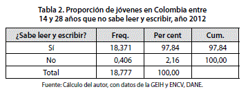 Si bien esta primera categoría explica en mayor medida el evento de que un joven no estudie, como se verá más adelante, para el caso del analfabetismo, se la ha tenido en cuenta con el ánimo de vislumbrar posibles razones que llevan a que un joven no sepa leer y escribir. En este punto cabe resaltar que el porcentaje de jóvenes en Colombia que sabe leer y escribir es del 97,84% en comparación con el 2,16% que no sabe (ver Tabla 2) y en consecuencia se considera analfabeta/o.