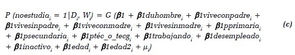 Donde la probabilidad de no estudiar o las dificultades que existen para acceder a educación dependen de un conjunto de variables dicótomas, ordinales y cuantitativas, la cuales contribuyen a comprender el fenómeno de la vulnerabilidad a no educarse por inasistencia (ver Ecuación c).