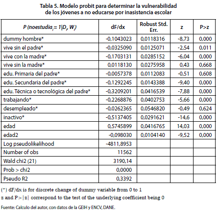 En general el modelo presenta un ajuste bastante bueno, a juzgar por el estadístico Wald y del pseudo R2, la significancia estadística individual es del 95% e incluso 99% en las siguientes variables: dummy de hombre, vive sin padre, vive con madre, padre con educación secundaria, padre con educación técnica o tecnológica, trabajando, desempleado, inactivo, edad y edad2 (ver Tabla 5).