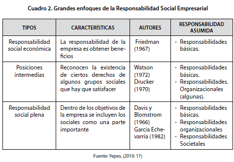 Como la Responsabilidad Social Empresarial es un tema de constante evolución, es importante y necesario interpretarlo desde diversos enfoques, con el fin de conocer los aportes y alcances que vienen teniendo desde hace varias décadas los promotores y defensores de la RSE, en donde se han involucrado todas y cada una de las relaciones que tiene el concepto con el medio económico, social y ambiental. Frente a este tema existen diferentes enfoques (Cuadro 2).