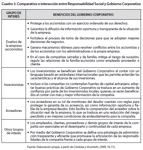 A continuación se mencionan algunos de los beneficios (Cuadro 3) que implica el buen gobierno corporativo (Córdoba y Vicentelli, 2009: 49):