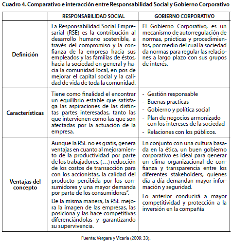 La Responsabilidad Social se hace cada vez más necesaria y cada vez debe estar más presente en el gobierno corporativo de las empresas; es por esto que en la Cuadro 4, se contrasta las características y ventajas de cada uno de los componentes señalados.