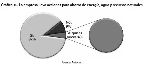 4.1.4 Medio Ambiente. En lo referente a la parte ambiental, se preguntó a los implicados si la entidad lleva a cabo acciones para el ahorro de energía, agua y recursos naturales, en la cual el 87% de los investigados afirmaron que la empresa lleva a cabo acciones muy sencillas, pero efectivas para este fin, tan solo un 9% expresó que no (Gráfica 10).