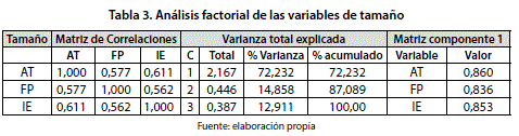 La realización de un análisis de componentes principales nos ha servido para agrupar las variables objeto de estudio en un único componente para cada uno de los constructos: tamaño, capacidad de financiación, capacidad económica y capacidad mixta. Según se puede observar en la Tabla 3, el primer componente (componente 1) explica el 86% del total de la información contenida en las tres variables de tamaño iniciales y cuyo valor propio es superior a la unidad. La alta correlación existente entre las variables justifica el análisis y la elección del componente como variable representativa del tamaño (TAM).