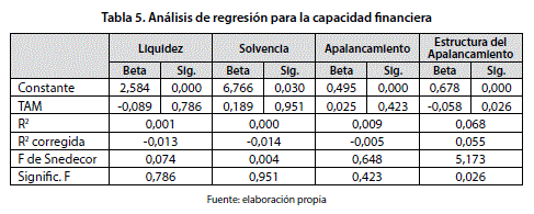 La Tabla 5 muestra los valores de los estadísticos, así como las medidas de R2 y F de Snedecor para demostrar el grado de explicación del modelo para la regresión de la capacidad financiera. Según la R 2, que indica la proporción de varianza explicada por el modelo al variar entre 0 y 1, ninguna de las variables consideradas permite una explicación del modelo, pues dichos valores están muy próximos al cero; solamente la variable estructura del apalancamiento muestra un valor algo mayor. Según la F de Snedecor, la única variable significativa es la estructura del apalancamiento, pues la significatividad de la F se sitúa por debajo de 0,05 (valor considerado como que el modelo es significativo). Según esta variable, la relación entre tamaño y capacidad financiera es negativa, dado que el coeficiente de la variable independiente toma valor negativo. Por tanto, rechazamos la hipótesis 1 según la cual el tamaño influye positivamente en la capacidad financiera de las cooperativas agrarias.