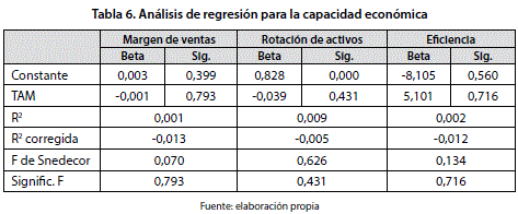 2) CE = B0 + B1 * TAM, donde CE es la capacidad económica medida a través de las variables margen de ventas, rotación del activo y eficiencia. Realizaremos tres regresiones lineales, una para cada variable.