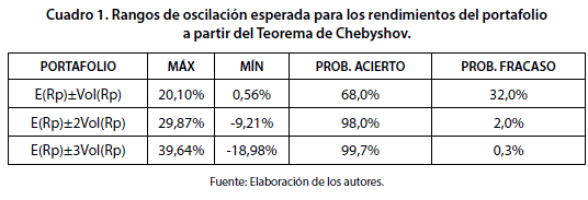 Considerando la composición de la cartera y su rendimiento anualizado estimado de 10.33% y el valor del riesgo de portafolio anualizado equivalente a 9.77%, fue posible utilizar el teorema expuesto por Pafnuti Chebyshov para determinar valores máximos y mínimos dentro de los cuales oscila el rendimiento de una cartera que se desprenden de adiciones y restricciones graduales de desviaciones estándar basadas en niveles de confianza del 68%, 98% y 99,7%. Los resultados del proceso se ilustran a continuación: