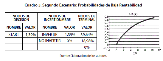 En el segundo escenario, la cartera de inversión exhibió un valor esperado de rendimiento negativo correspondiente a 1,39% como resultado de una probabilidad estadística del 30% alta rentabilidad combinada con una probabilidad del 70% vinculada a la posibilidad de baja rentabilidad. Adicionalmente el resultado de 1,39% es inferior a la opción de no invertir. En consecuencia, el portafolio de inversión no resiste satisfactoriamente un escenario adverso.