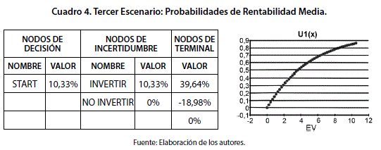 El tercer escenario sitúa a portafolio de inversión con un valor medio de rendimiento equivalente a 10,33% producto de una combinación de probabilidades del 50% para los eventos de alta rentabilidad y baja rentabilidad. El resultado se basa en la ocurrencia de las aplicaciones de Markowitz y por consiguiente, implica que en el escenario probable las conclusiones obtenidas en el análisis optimizado de media varianza se aplican satisfactoriamente.