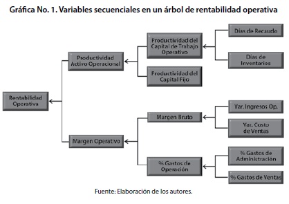 Dentro de una óptica financiera, la generación de valor depende de la rentabilidad operativa de los activos netos y del costo promedio ponderado de capital. A su vez la rentabilidad operativa de los activos netos depende de la productividad de los activos operacionales y su margen operativo. La productividad del activo operacional se explica por la productividad del capital de trabajo y la productividad del capital fijo. El margen operativo está determinado por el margen bruto y el porcentaje de gastos de operación. De otra parte el Costo Promedio Ponderado de Capital depende del costo de las fuentes de financiamiento, deuda y patrimonio y la estructura de capital de la empresa. Para permitir una descripción gráfica del conjunto de relaciones y la dependencia existente entre las variables se exhibe la gráfica No. 1, donde se explican los factores que inciden en la rentabilidad operativa.