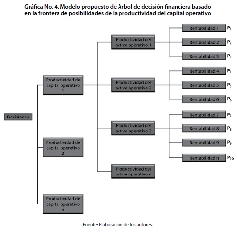 El gráfico 4 presenta de forma más concreta, la cantidad de escenarios que una empresa puede advertir, como consecuencia de productividades del activo operativo esperadas, que en efecto, dependen a su vez, de las decisiones suscitadas en la productividad del capital operativo. Aun cuando lo anterior, puede pretender un cambio temporal en la forma de analizar el comportamiento de la rentabilidad o, dicho de otra forma, sugerir un estudio desafiante enfocado hacia el futuro bajo la premisa de considerar las implicaciones venideras experimentadas como fruto de decisiones presentes, es relevante considerar tres aspectos que no pueden pasar inadvertidos frente al tratamiento teórico y de modelación para el estudio de esta clase de fenómenos económicos y financieros, i. las alternativas de decisión ii. Sus probabilidades de ocurrencia asociadas y iii. Las consecuencias de un evento, lo que se tratará en breve.