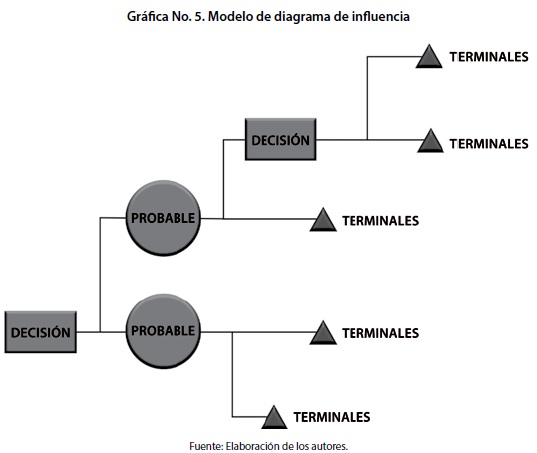En la gráfica 5 es posible advertir un diagrama de influencia que representa el árbol de decisión. En el mismo se establecen tres tipos de nodos, los nodos de decisión; los nodos de probabilidad y finalmente, los nodos terminales en triángulos. Los primeros comprometen una actividad deliberada como estudiar una maestría, aceptar una propuesta laboral, salir de viaje, comprar maquinaria, reducir los costos operativos, capacitar empleados, entre otros. Los segundos involucran sucesos probables que están sujetos situaciones de riesgo e incertidumbre como por ejemplo, enfermarse en la fecha de una evaluación, estabilidad laboral, accidentes de tránsito, aparición de nuevas tecnologías, etc. Por último, los nodos terminales expresan los resultados de un proceso, también denominados consecuencias económicas. Las secuencias se conectan a través de rutas que permiten comprender las relaciones de causa-efecto entre las variables.