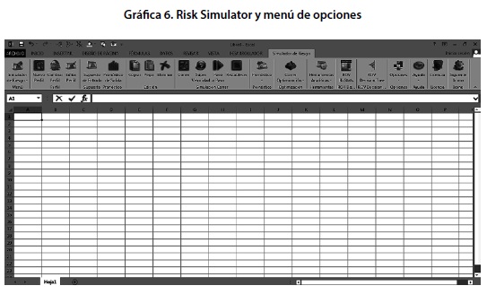 Una vez planteado el mentefacto o diagrama de influencia se procede a abrir el programa RISK SIMULATOR que, en esencia constituye un complemento de Excel direccionado al tratamiento de análisis de riesgo. Para acceder al instrumento, el usuario debe dirigirse dentro del menú central a la opción “Simulador de Riesgo” y precisar dentro de ella el componente de construcción y evaluación de árboles de decisión denominado “ROV Decision Tree”.