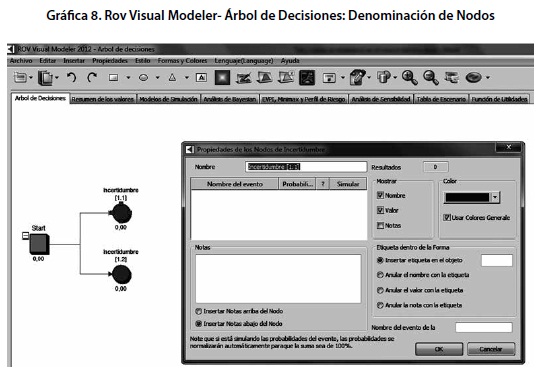 En el menú central de ROV visual modeler- árbol de decisiones, el usuario debe elegir la opción “insertar” y en el submenú deberá elegir los nodos correspondientes al problema particular que desea resolver, que como se explicó anteriormente se clasifican como nodos de decisión, nodos de incertidumbre y nodos terminales. Si se han introducido por ejemplo, dos nodos de incertidumbre, es posible personalizar cada uno de ellos haciendo click y asignándoles un nombre, tal y como se expresa a continuación.