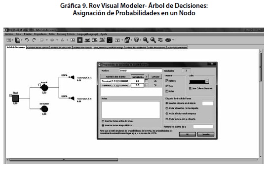 Los valores de 0 que se ubican en la parte inferior de cada nodo corresponden a los valores que hasta el momento describen cada una de las opciones y que, en efecto se resolverán en el nodo de decisión. A continuación, sobre el primer nodo de incertidumbre se introducen dos nodos terminales. En seguida, si se hace click nuevamente sobre el primer nodo “Invertir” es posible establecer el valor de probabilidad correspondiente a los dos nodos que de él se desprenden, considerando, desde luego que la suma de probabilidades debe ser igual al 100% o la unidad. En este caso, si se tiene en mente la constitución de un escenario optimista se establece de manera deliberada que la probabilidad del primer nodo terminal será del 70% (digitado como 0.7) y la probabilidad del segundo nodo terminal abarcará el 30% restante.