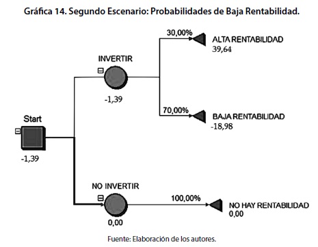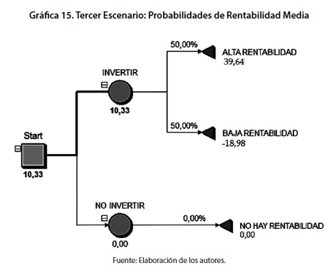La lectura de un árbol de decisión se lleva a cabo a partir de asegurar unas condiciones de rentabilidad en el portafolio tales que, evalúen la decisión de invertir en escenarios diversos y factibles. Así por ejemplo, si los rendimientos de un portafolio, dada una probabilidad estadística asociada son superiores a las consecuencias económicas de no invertir, conducen indefectiblemente a redefinir el proceso de toma de decisiones y concentrarlo en la inyección de recursos. Las combinaciones de probabilidad originan tantos escenarios como es posible, no obstante, en este apartado se han ejemplificado tres escenarios convencionales, el primero de alta probabilidad de rendimiento, el segundo basado en bajas probabilidades de rendimiento y finalmente, un escenario de probabilidades moderadas.