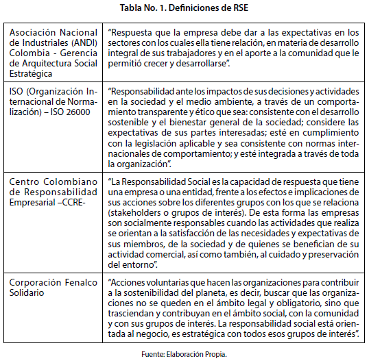Estos modelos se acompañan de la conformación conceptual de instancias del sector productivo colombiano tales como el Comité y la Gerencia de Responsabilidad Social que en la actualidad reside en la Gerencia de Arquitectura Social Estratégica de la ANDI , y de la creación de organizaciones dedicadas a promover la Responsabilidad Social, tales como el Consejo Empresarial Colombiano para el Desarrollo Sostenible CECODES, creado en 1993, conformado por 38 empresas y 4 gremios de los sectores más relevantes para la economía colombiana (agroindustria, minería, forestal, energía, manufacturera, construcción y financiera). Desde el sector financiero Asobancaria es la entidad que agremia y promueve proyectos desde la banca, además es quien divulga información relevante para todos los grupos que inciden directa o indirectamente en la gestión de las organizaciones que pertenecen al sector. En la tabla No. 1 se puede apreciar algunas de las definiciones del tema en organizaciones relevantes para el país.