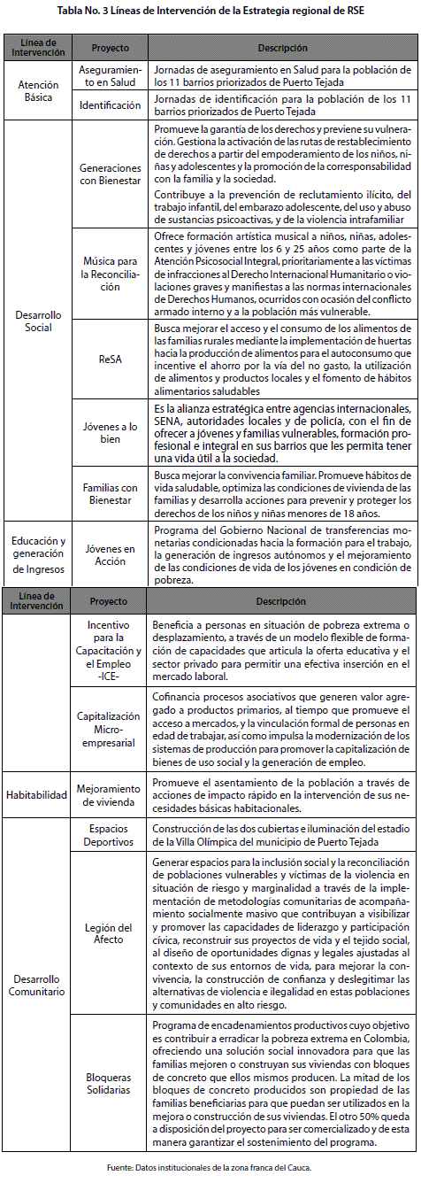 A partir de la integración de los actores anteriormente mencionados, se plantea como objetivo para el mejoramiento de la región identificar cuales serían las principales líneas de intervención de acuerdo con las capacidades de los actores y los recursos disponibles. En asocio con el Departamento de Prosperidad Social, los empresarios de la zona franca del Cauca y algunas de sus fundaciones, establecieron la denominada Alianza por lo Social, e identificándose 5 líneas de intervención con 14 proyectos orientados principalmente al municipio de Puerto Tejada, que se presentan en la tabla No. 3.