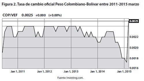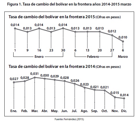 Fernández (2015) analiza un escenario en la frontera, si un venezolano cambia el valor de su salario mínimo mensual (5.644 bolívares) a pesos colombianos en la frontera, con la tasa que se manejaba iniciando 2015 podía obtener $70.000, mientras que si hace este mismo cambio hoy recibiría $56.440 (menos de 10% del salario mínimo equivalente a $644.350), se indica en el artículo que en palabras del investigador del Observatorio de Venezuela de la Universidad del Rosario, Ronal Rodríguez, “Mientras la economía venezolana no sea regular, sino que se cometan estos cambios fuertes será mucho más complicado estrechar las relaciones comerciales, porque no se sabe cuándo sube o baja el bolívar. Los venezolanos que importan lo hacen a tasas preferenciales y el comercio entre Colombia y Venezuela se ha desplomado porque no hay garantías de pago por parte de Venezuela. No hay seguridad jurídica”.