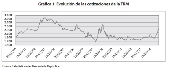 En las siguientes gráficas se muestra el comportamiento de las cotizaciones diarias de la TRM, los precios del crudo WTI y la tasa de referencia para el periodo comprendido entre el 24 de febrero de 2000 hasta el 30 de diciembre de 2014.
