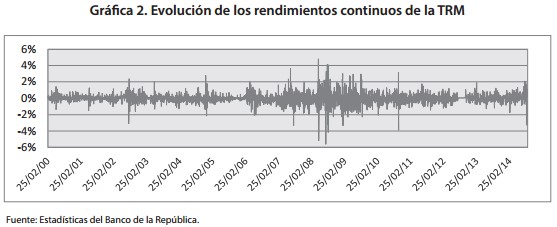 Las cotizaciones de la tasa de cambio son volatiles a lo largo del periodo analizado, sin embargo, los rendimientos continuos de la TRM presentan un comportamiento más estable que oscila entre 2% y -2%, salvo una perturbación que se ostenta en el año 2008 (ver grafica 2).