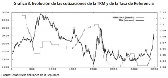O objetivo desta pesquisa é relacionar a referência taxa de juro, os preços do petróleo e da taxa de câmbio nominal; para determinar em que medida cada uma dessas variáveis exógenas afetam a taxa de câmbio. A metodologia utilizada para esta finalidade é de manejar a teoria levantada por Mauricio Cárdenas (Introdução à Economia colombiana, 2013) ea implementação de Mundell - Fleming. A análise é feita através da aplicação de modelos de regressão utilizando mínimos quadrados ordinários, GARCH, EGARCH e VAR. O estudo adverte que a taxa de câmbio foi influenciada por elementos, tais como: o menor preço do WTI, o colapso das principais bolsas de valores do mundo, a decisão do banco central dos EUA para manter a sua taxa de juro de referência e a desvalorização da moeda chinesa Yuan. O estudo conclui que o preço do petróleo e da taxa de câmbio está negativamente relacionado, de modo à desvalorização dos preços do petróleo leva a uma desvalorização do peso. Da mesma forma, a taxa de juro de referência está inversamente relacionada com a taxa de mudança, permitindo aceitar referências de Mundell - Fleming.