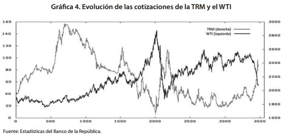 Se sabe de la alta dependencia del petróleo como bien de exportación y fuente de divisas, por lo tanto, sus fluctuaciones afectan radicalmente la tasa de cambio, ante esto, se observó que la cotización más baja del precio del petróleo afectó positivamente la tasa de cambio en 802 pesos, es decir, la desvalorización del WTI condujo a una depreciación de la moneda local en 802 pesos respecto al dólar estadounidense.