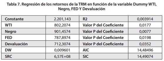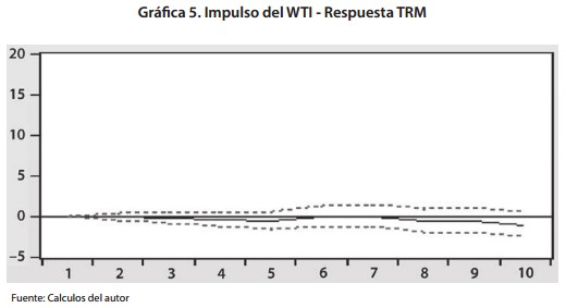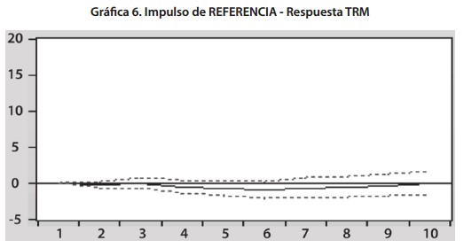 Las perturbaciones en las cotizaciones del WTI salieron significativas y afectan negativamente la tasa de cambio local, el impacto se transmite de manera directa, pues no hay rezagos ni efectos acumulados en las variables. En efecto, al incrementarse en una unidad monetaria el precio del petróleo la tasa de cambio nominal tiende a reducirse en 8,75 pesos. De manera análoga, las fluctuaciones en la tasa de referencia son significativas para el periodo analizado y ejercen un efecto negativo sobre la tasa de cambio nominal; Así, un incremento en un punto porcentual de la tasa de referencia provoca una reducción en la tasa de cambio nominal de 875,26 pesos.